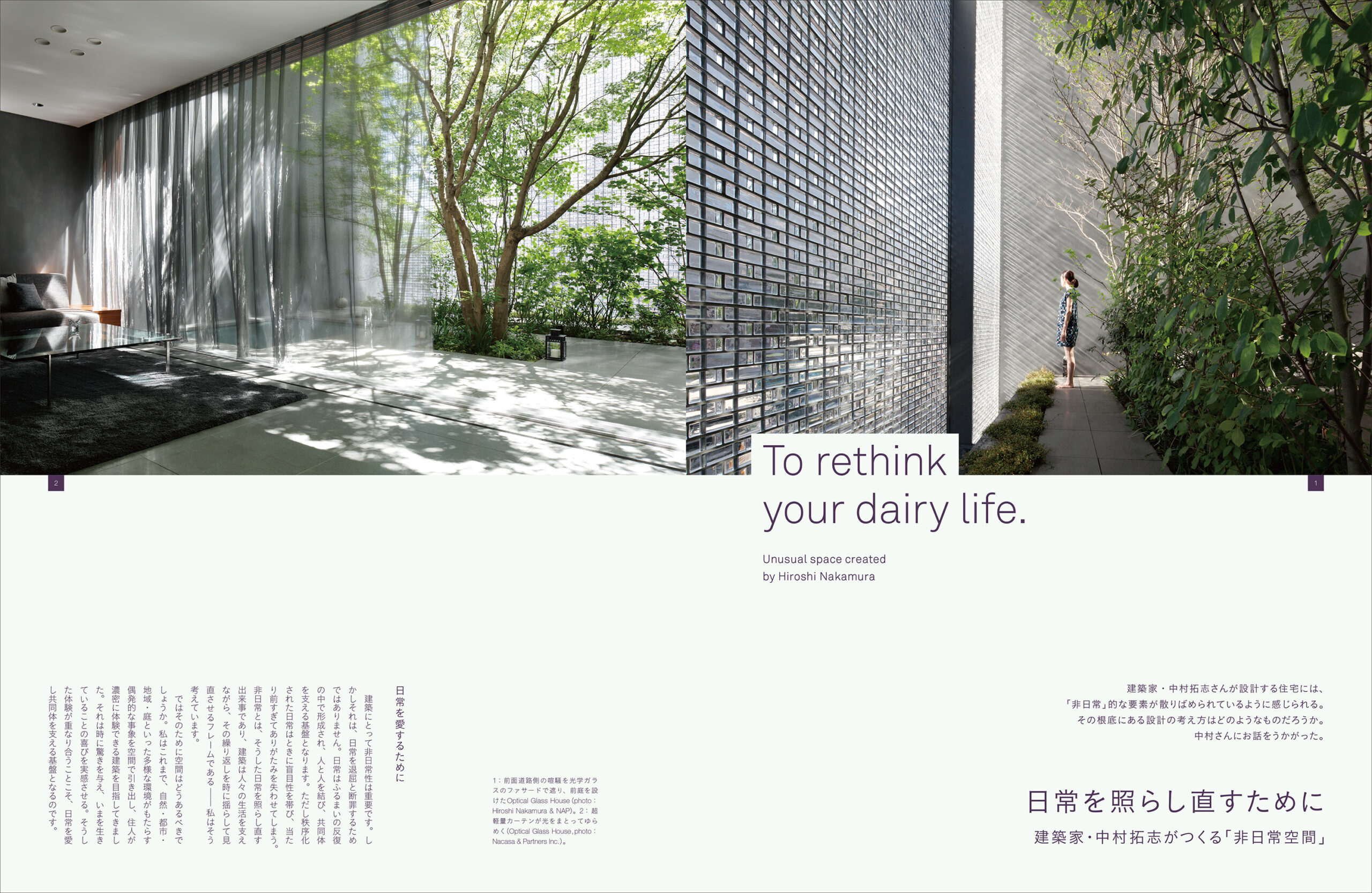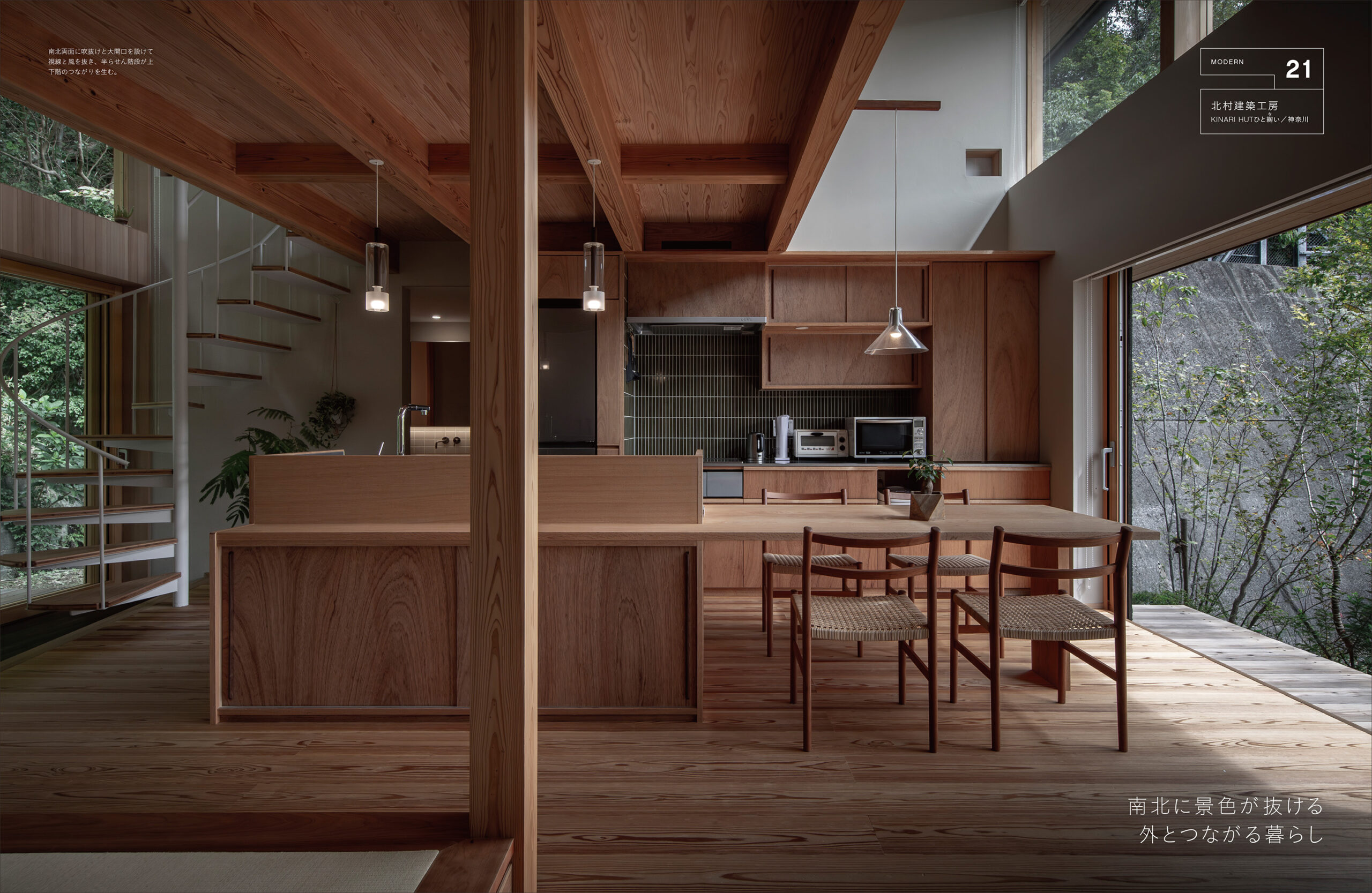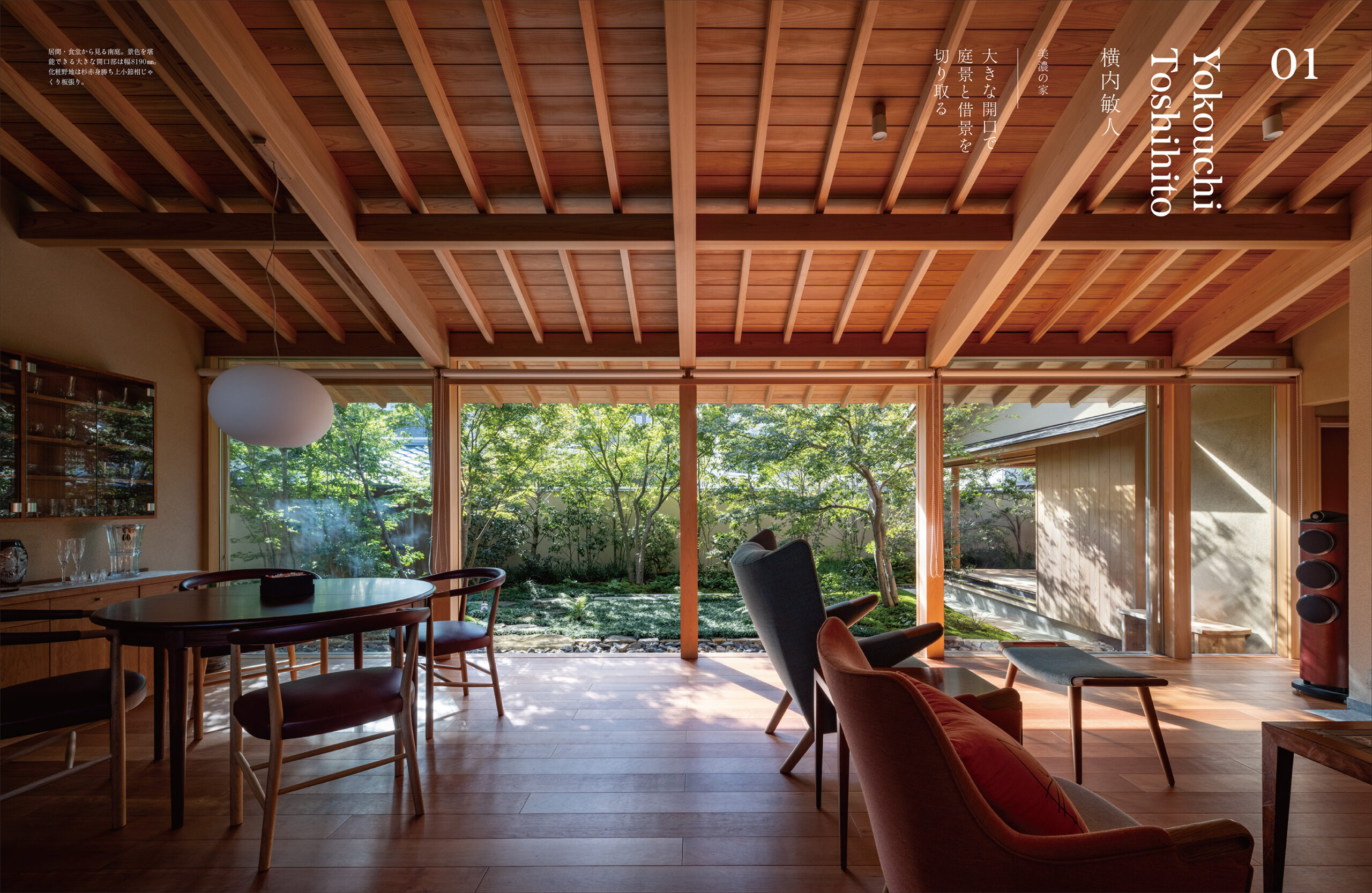 建築家・中村拓志さんの「北庭の家」。上下階に日本庭園を配し、伝統美と現代的な空間構成が魅力的な住まいで、北向きの室内にやわらかな自然光が差し込み、垂木天井が内外をつなぎます。